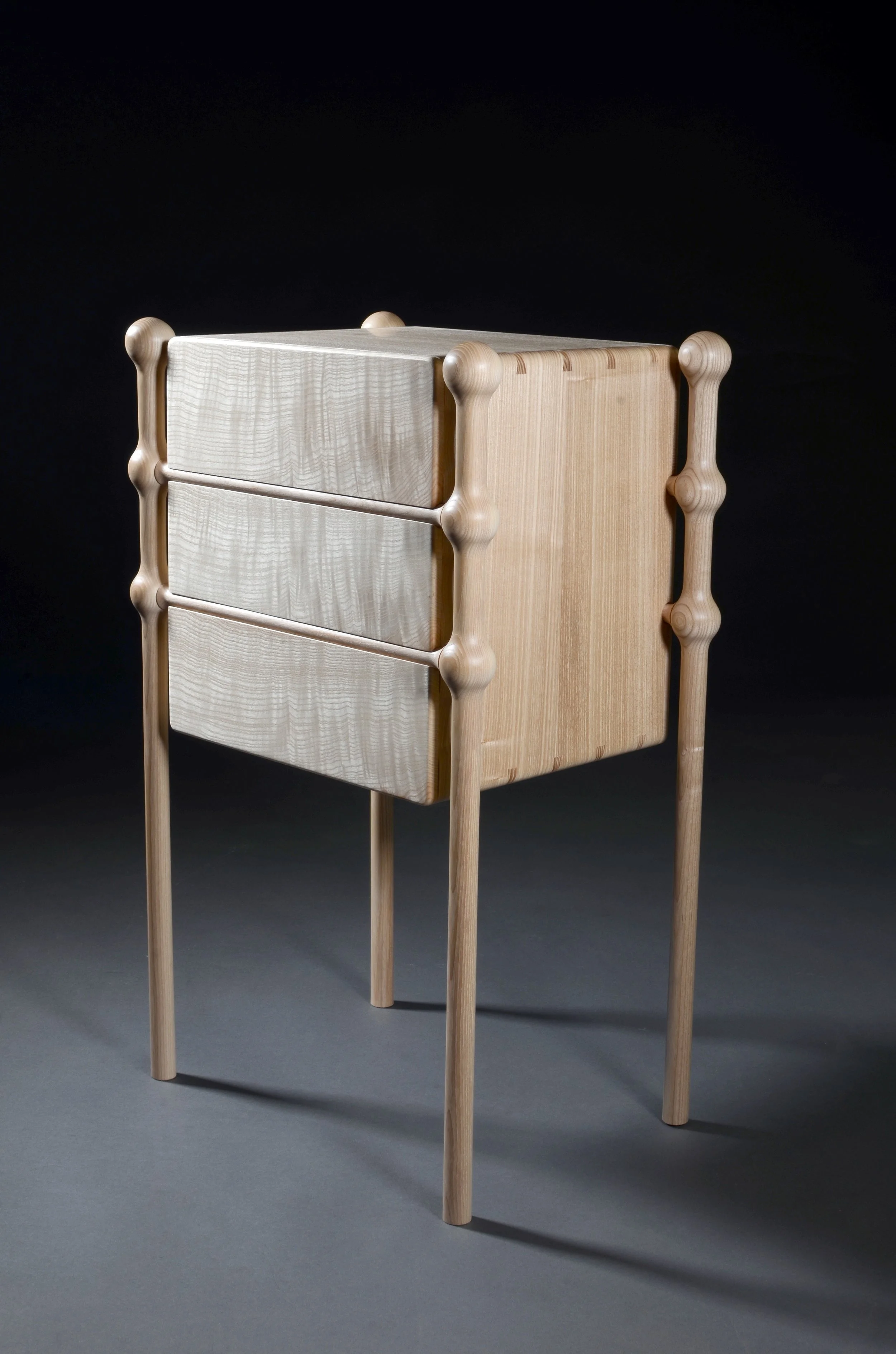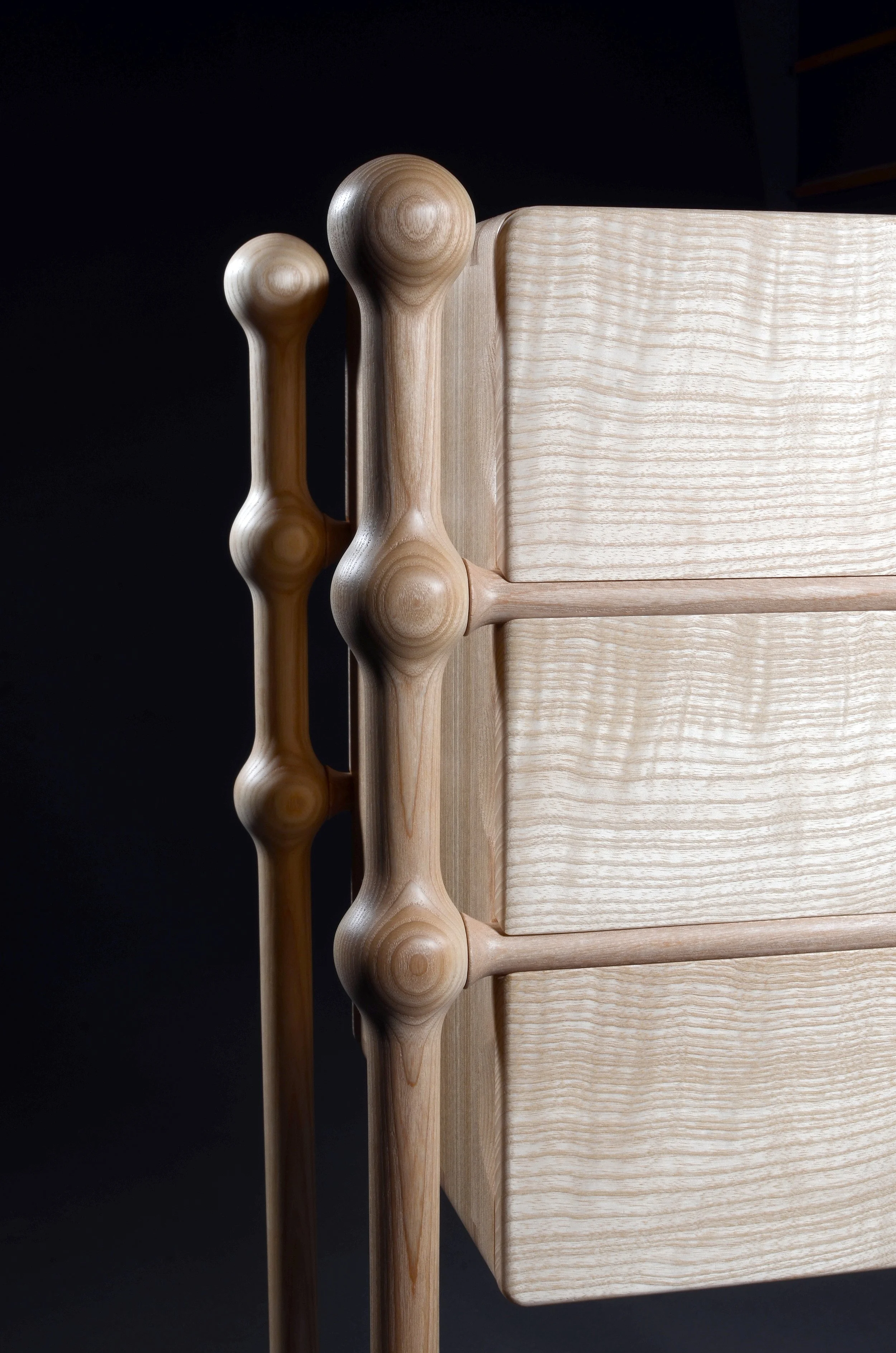 Made from solid ash, this sculptural three-drawer chest takes inspiration from the human form. The supporting frame echoes the ribcage, while the soft, rounded joints where the frame meets the legs reference the shoulder’s ball-and-socket joint.