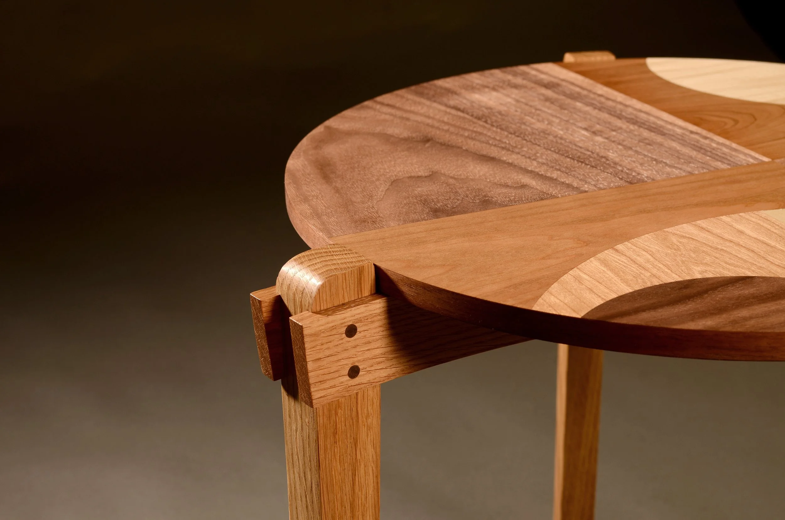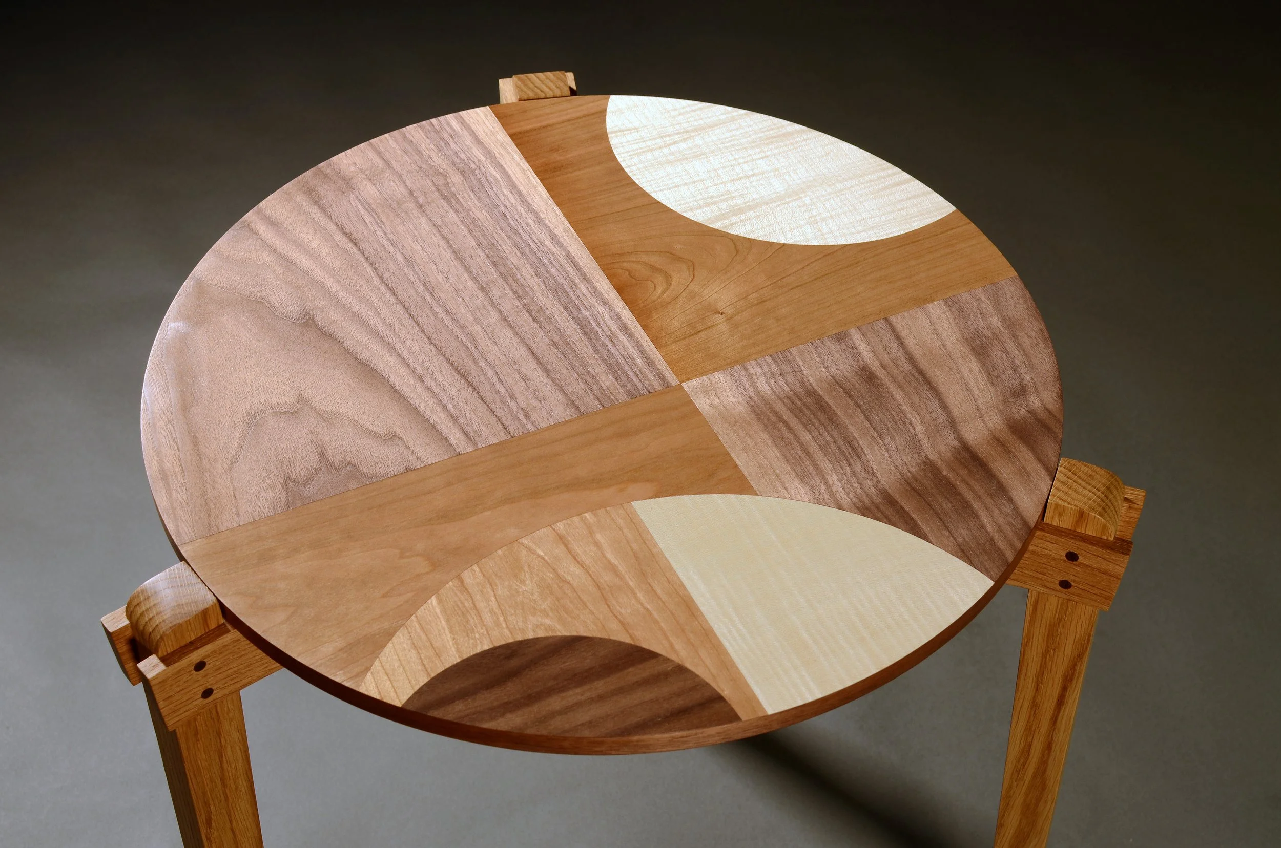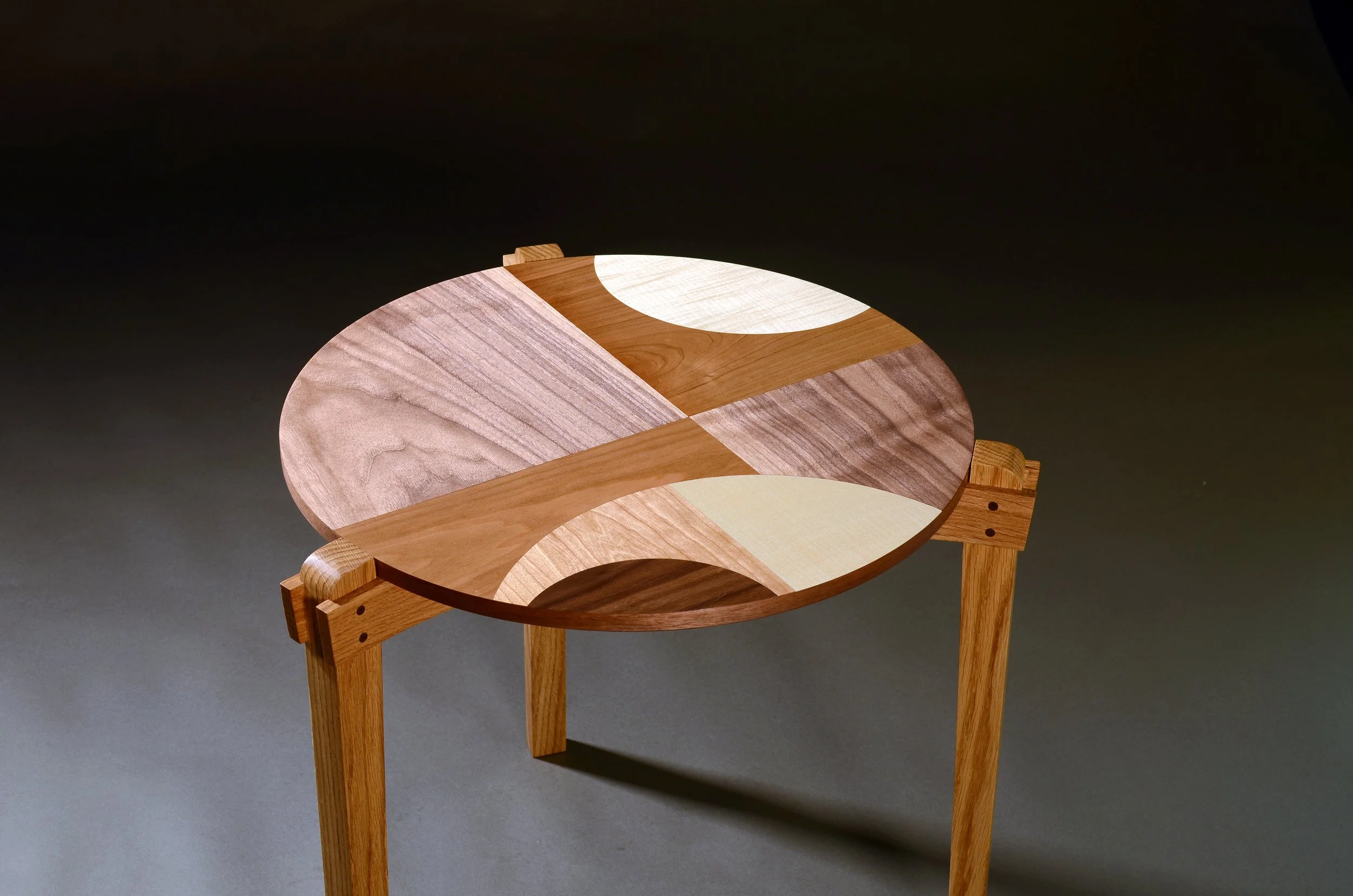 Tri-tableScroll ↓ Side tri-table wth solid oak legs featuring a hand made walnut, cherry and sycamore marquetry top.